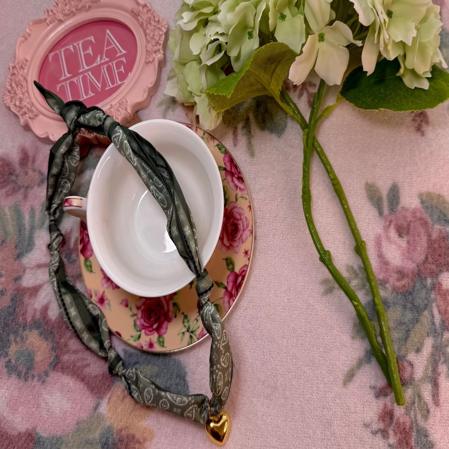 Green Scarf Necklace with a Gold Solid Heart Charm