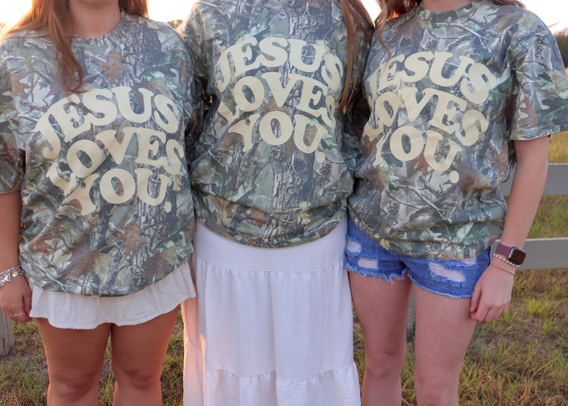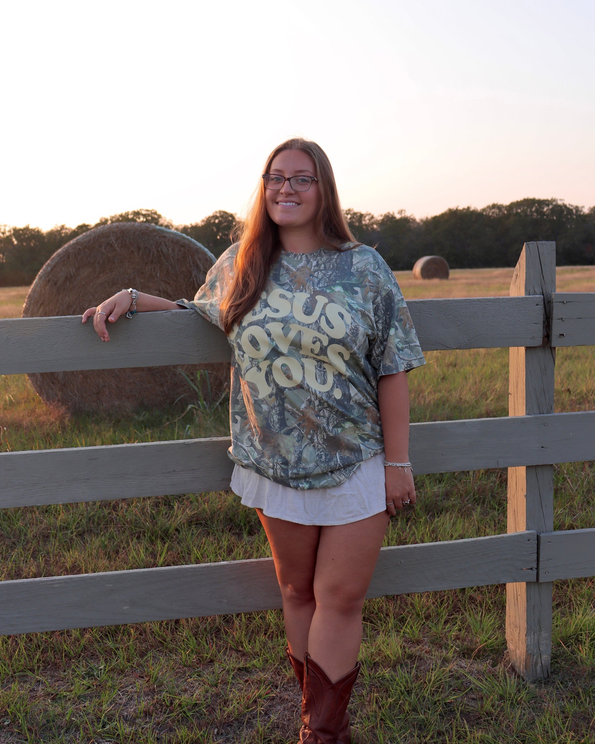 Faith meets fashion in the cutest way. Our Jesus Loves You Camo Tee blends a soft, outdoorsy camo print with a bold, uplifting message you can wear anywhere. Designed with an oversized and relaxed fit.