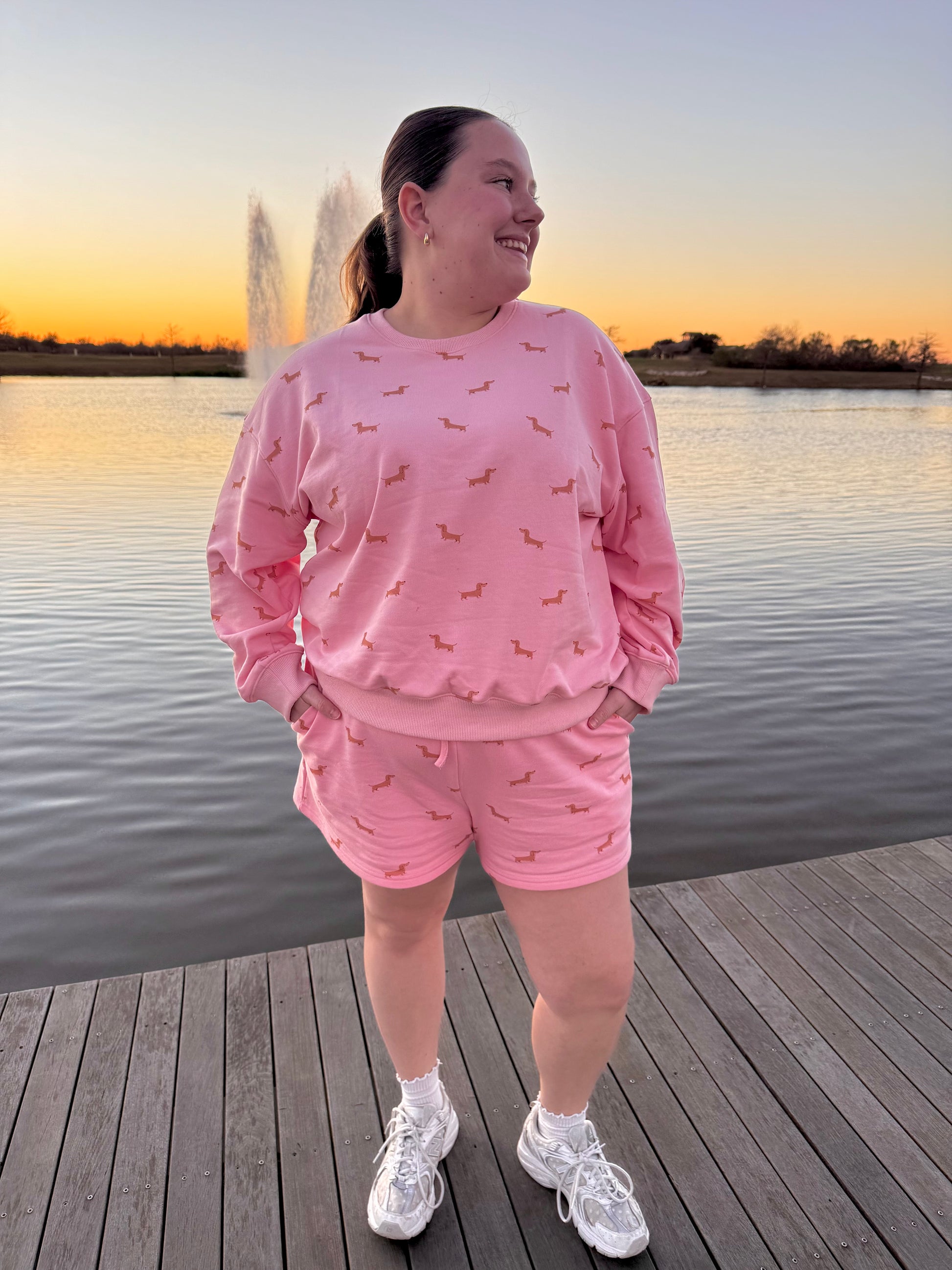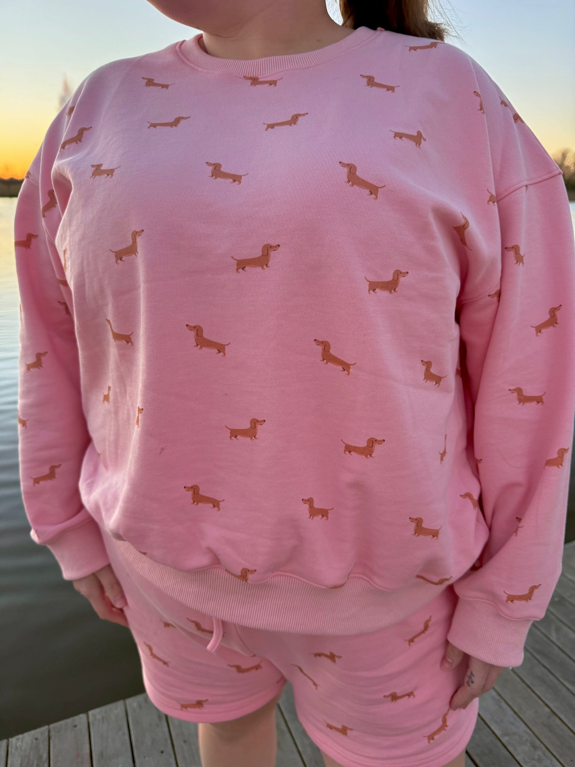 Fall head over heels for comfort in our Puppy Love Lounge Set. This ultra-soft matching set features a relaxed long-sleeve sweatshirt and comfy drawstring shorts, all in the sweetest blush pink with an adorable dachshund print throughout. Designed for lounging, running errands, or cozy nights in, this set is equal parts cute and comfy.